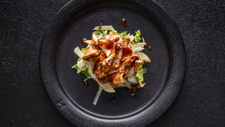Legg laksen over på varm grill og grill under lokk i 15-20 minutter. Laksen er klar når den flaker seg lett, men skal fortsatt ha en saftig og «rosa» kjerne. Pensle på mere saus mot slutten av grill tiden. Rens og skjær fennikel og eple i tynne skiver. Riv hjerte salaten og bland sammen fennikel, eple og salat. Vend inn en klunk olivenolje og noen gode dråper sitronsaft. Krydre lett med salt og pepper. Smør briochebrødene (underdelene) med litt Drittforbanna Bruschetta med Paprika & Spekeskinke, legg på fennikel- og eplesalat og topp med grillet laks (bruk en skje og løsne fiskekjøttet fra skinnet) og brød.