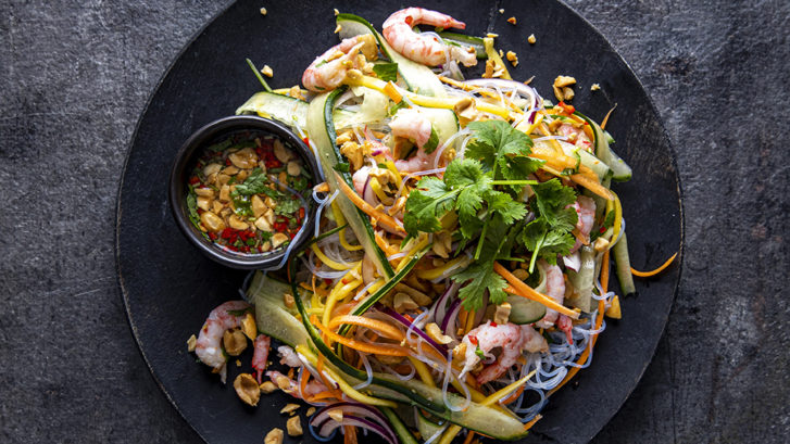 Kok nudlene som beskrevet på pakken. Skyll dem i kaldt vann og la de få renne godt av seg. Skrell og skjær gulrøtter, agurk, mango og rødløk i tynne strimler. Lag dressingen. Rens og finhakk chili og hvitløk, eller knus det sammen i en morter til en fin mos. Bland inn resten av ingrediensene. Bland sammen nudler, grønnsaker, mango, reker og dressing. Dryss over hakkede peanøtter og lit ekstra koriander ved servering.