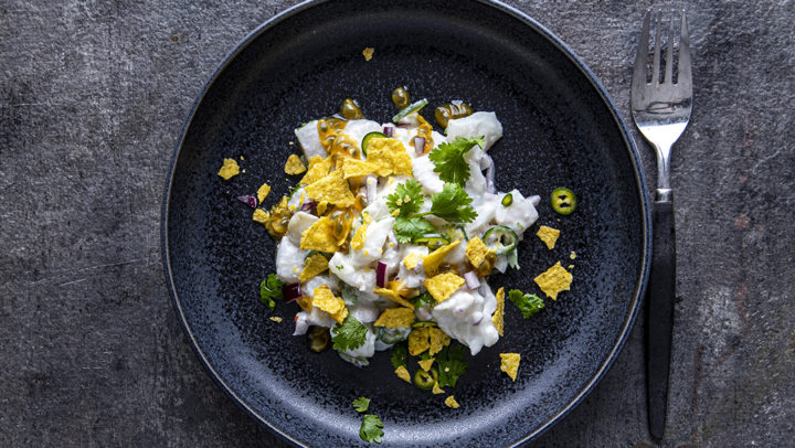 Skjær fisken i jevne biter på tvers av fibrene i kjøttet. Visp sammen limesaft, eddik og salt. Hakk løken og bland sammen fisk, marinade og løk. La det marinere i kjøleskapet til fisken virker «kokt», cirka 1 time. Sil av marinaden og bland fisken sammen med kokosmelk, finsnittet jalapeno og litt hakket koriander. Fordel chevichen på tallerkener eller bruk et passende fat/tallerken. Dryss over knust tortillachips.