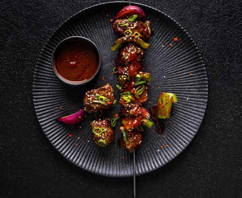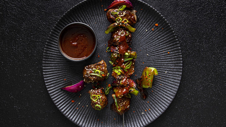 Snu spydene ofte slik at kjøttet blir jevnt grillet. Pensle over bbq-saus helt mot slutten av grillingen. La gjerne spydene få hvile et par minutter og dryss over sesamfrø og hakket vårløk før servering.