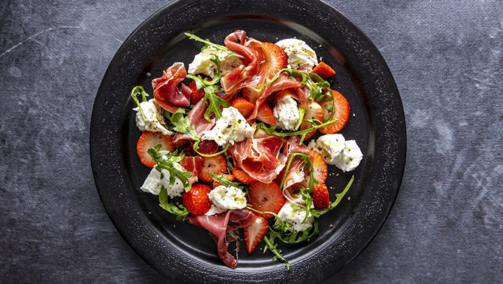 Jordbær, mozzarella og spekeskinke med dadler og fiken eddik