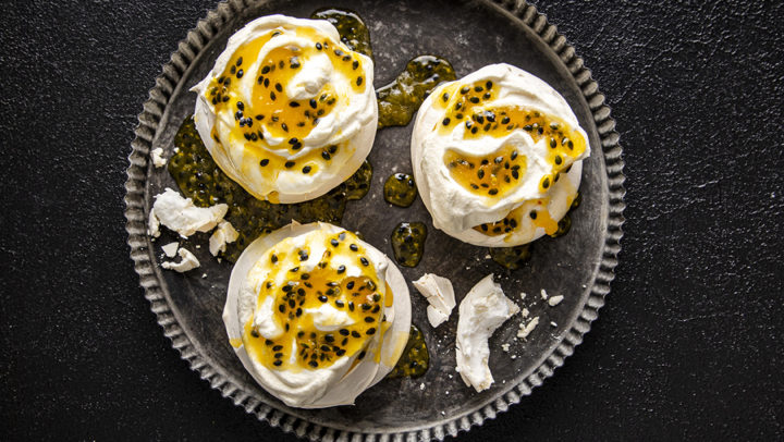 Visp fløten til myk krem. Topp pavlovaene med krem og pasjonsfruktsaus.