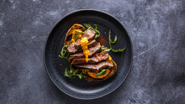 Bruschetta med Paprika & Spekeskinke. Krydre biffene med salt og pepper. Stek biffene over høy varme, cirka 2 minutter på hver side i en blanding av smør og olje. La biffene hvile noen minutter før du skjærer dem i skiver. Legg biffskivene over på brødskivene og topp med litt ruccolasalat vendt med noen dråper olivenolje, sitronsaft og en klype salt.