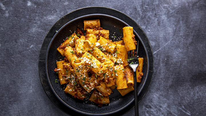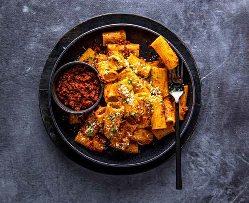 Kok pastaen «al dente». Hell av kokevannet, ha pastaen tilbake i gryta og rør inn arrabiata-sausen. Fordel pastaen på tallerkener og dryss over revet parmesan og litt hakket persille eller basilikum hvis ønskelig.