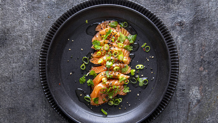 Skjær laksen i tynne skiver og legg skivene pent på tallerkener eller et fat. Drypp over olivenolje og eddik. Dryss over sesamfrø, finsnittet vårløk og hakket koriander. Serveres med soyasaus.