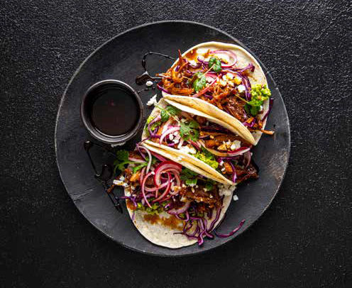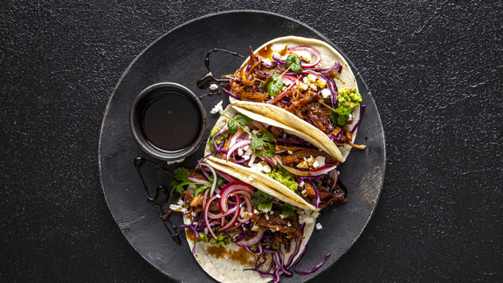Riv det varme kjøttet fra hverandre med to gafler og vend det sammen med BBQ sausen. Fyll varme tortillas med saftig kjøtt, rødkål, guacamole, syltet rødløk, ost…, eller fyll på med noe annet godt du synes er digg på din taco.