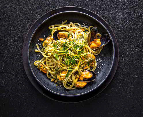 Hakk hvitløk og løk. Varm en god klunk olje i en romslig gryte og fres hvitløk og løk under omrøring til løken blir myk og blank. Tilsett blåskjell, rør godt, hell i vin og legg på lokk. Damp blåskjellene til de åpner seg. Løft de dampede skjellene opp fra kasserollen, kraften skal være igjen. Kast eventuelle skjell som ikke har åpnet seg. Spar noen hele skjell til pynt og plukk skjellmaten ut av resten. Kok inn kraften til omtrent halv mengde og rør inn pesto.